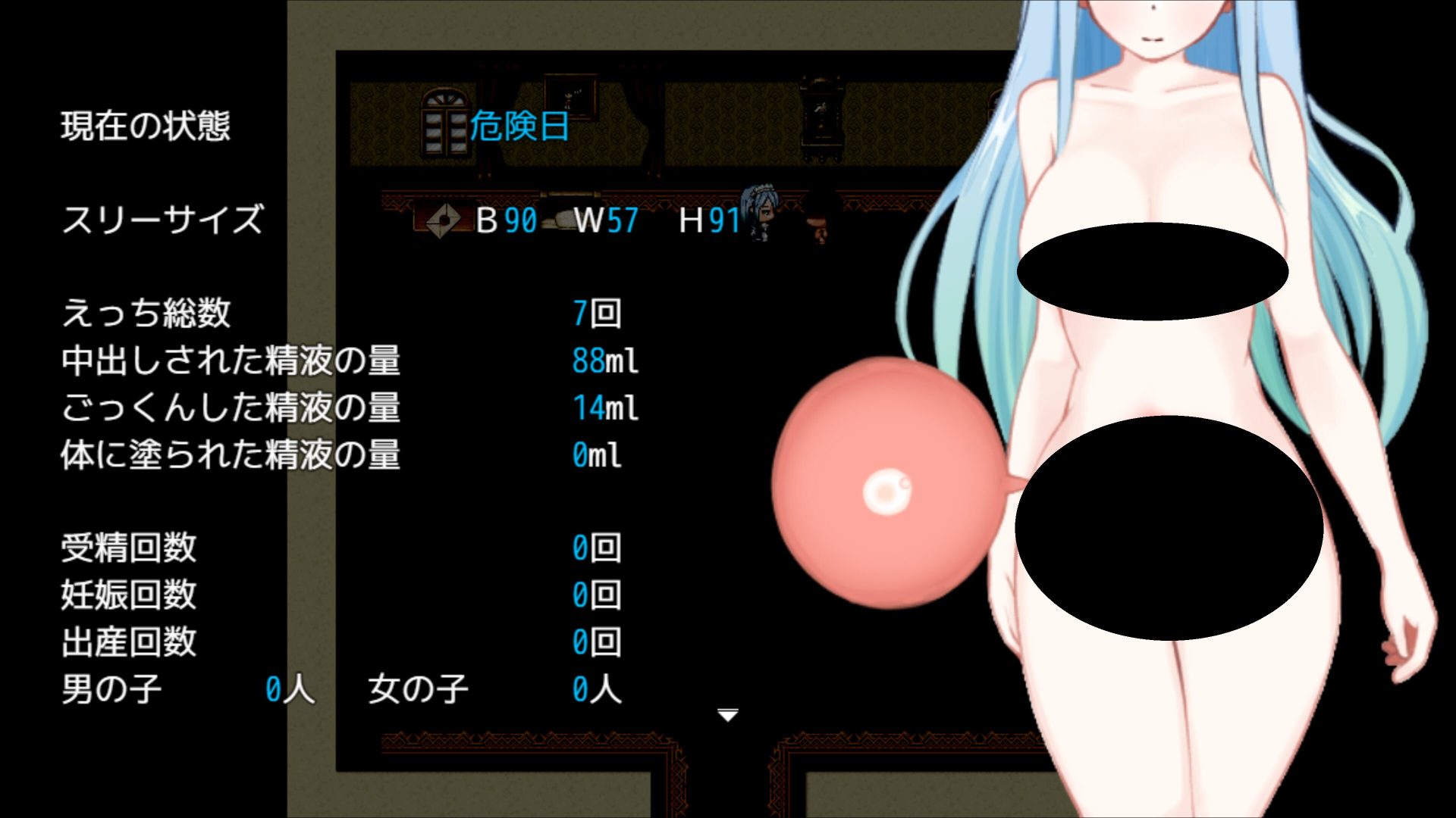 플레이타임은 100% 치트 사용 및 출산씬 스킵 시 위험일 일주를 1분 10초로 잡았을 때의 계산값입니다.